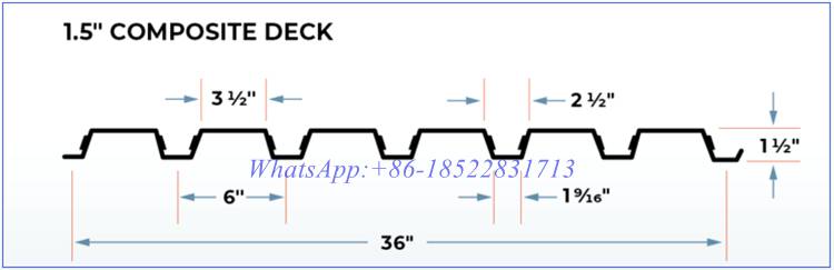 1.5” Composite deck b decking roll forming machine is one of equipment used in the manufacturing and construction industry to produce B Deck profiles. B Deck is a type of corrugated metal decking that is commonly used as a structural component in roofing and flooring systems. It provides support and stability to buildings and is often used in commercial and industrial construction projects.