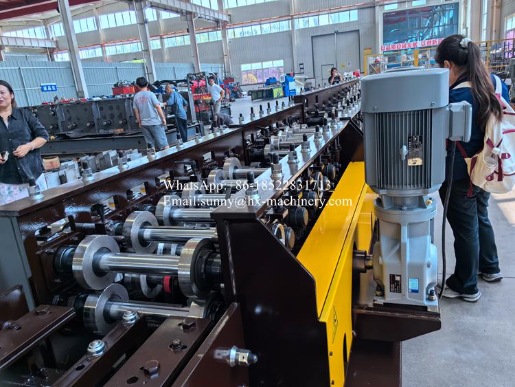 | 6 | Roll forming part | 1. Shaft diameter φ65mm 2. Shaft material 45# steel 3. Forming pass number 32 4. Main motor power 5.5KW×3 5. Automatic opening and closing motor 1.5KW×3 5. Roller material Cr12 6. Roller hardness HRC58-62 |