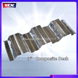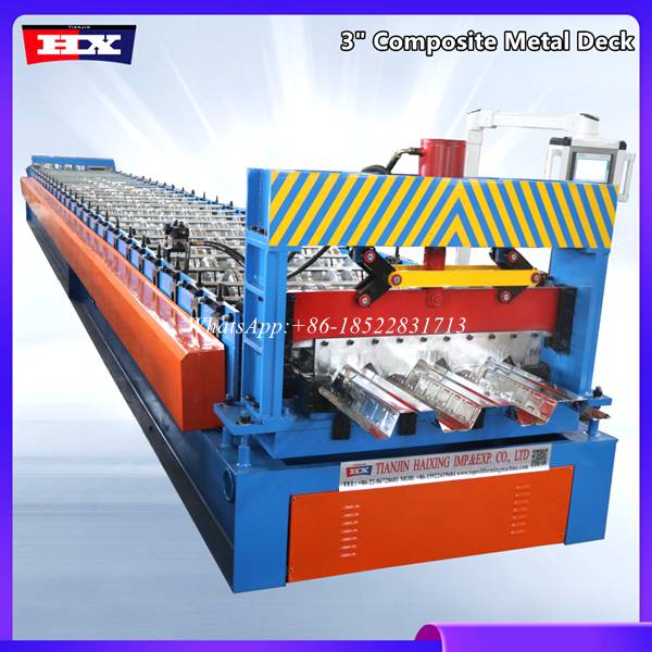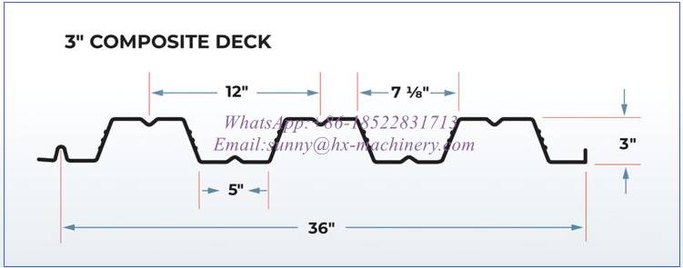 3” Composite metal decking metal deck roll forming machine production the 3″ deck sheet is standard with an interlocking joint and a run-off leg so that the deck can be installed either with a button punched or a side lap fastener. Hanger tabs can be specified for drop ceiling attachment to the bottom of the deck.