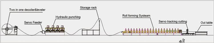 Uncoiling → Leveling → Roll forming system→ Punching system→ Cutting system → Products receiving table