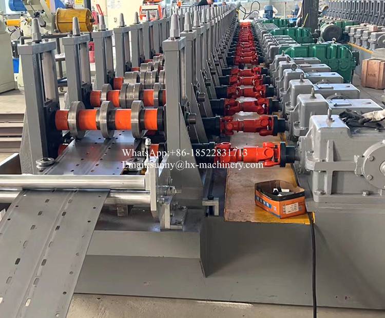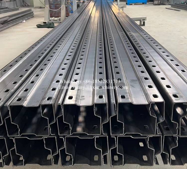 Upright rack roll forming machine is a specialized, automated production line designed for the high-volume, continuous manufacturing of the vertical support columns (uprights) used in pallet racking, storage systems, and heavy-duty shelving.This machine transforms coils of high-strength steel (typically 450MPa to 550MPa yield strength) into precise, roll-formed upright profiles with consistent, complex cross-sections.